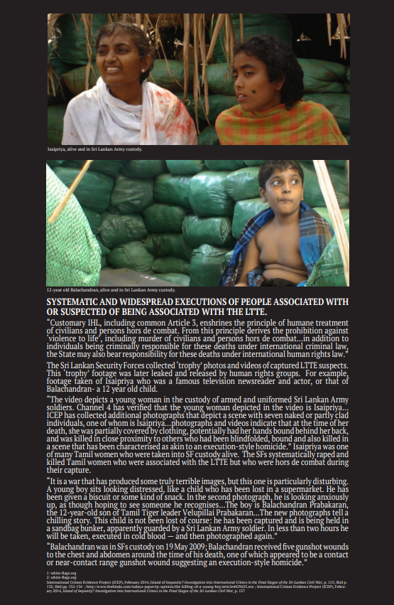 Systematic and widespread executions of people associated with or suspected of being associated with the LTTE. The Sri Lankan Security Forces collected ‘trophy’ photos and videos of captured LTTE suspects. This ‘trophy’ footage was later..Read More