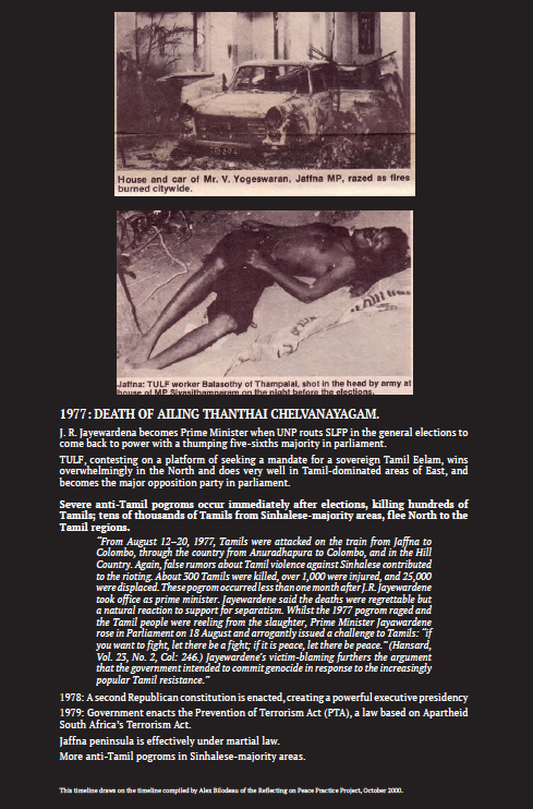 Death of ailing Thanthai Chelvanayagam. J.R. Jayewardena becomes Prime Minister when UNP routs SLFP in the general elections to come back to power with a thumping five-sixths majority in parliament.